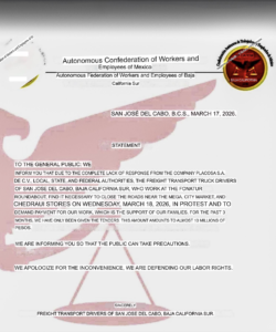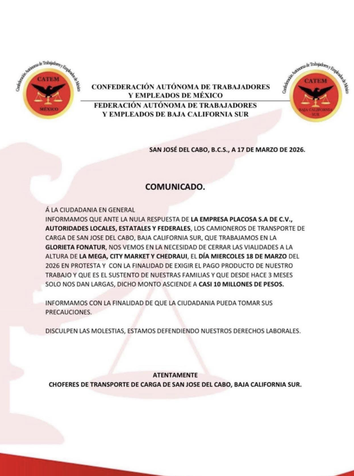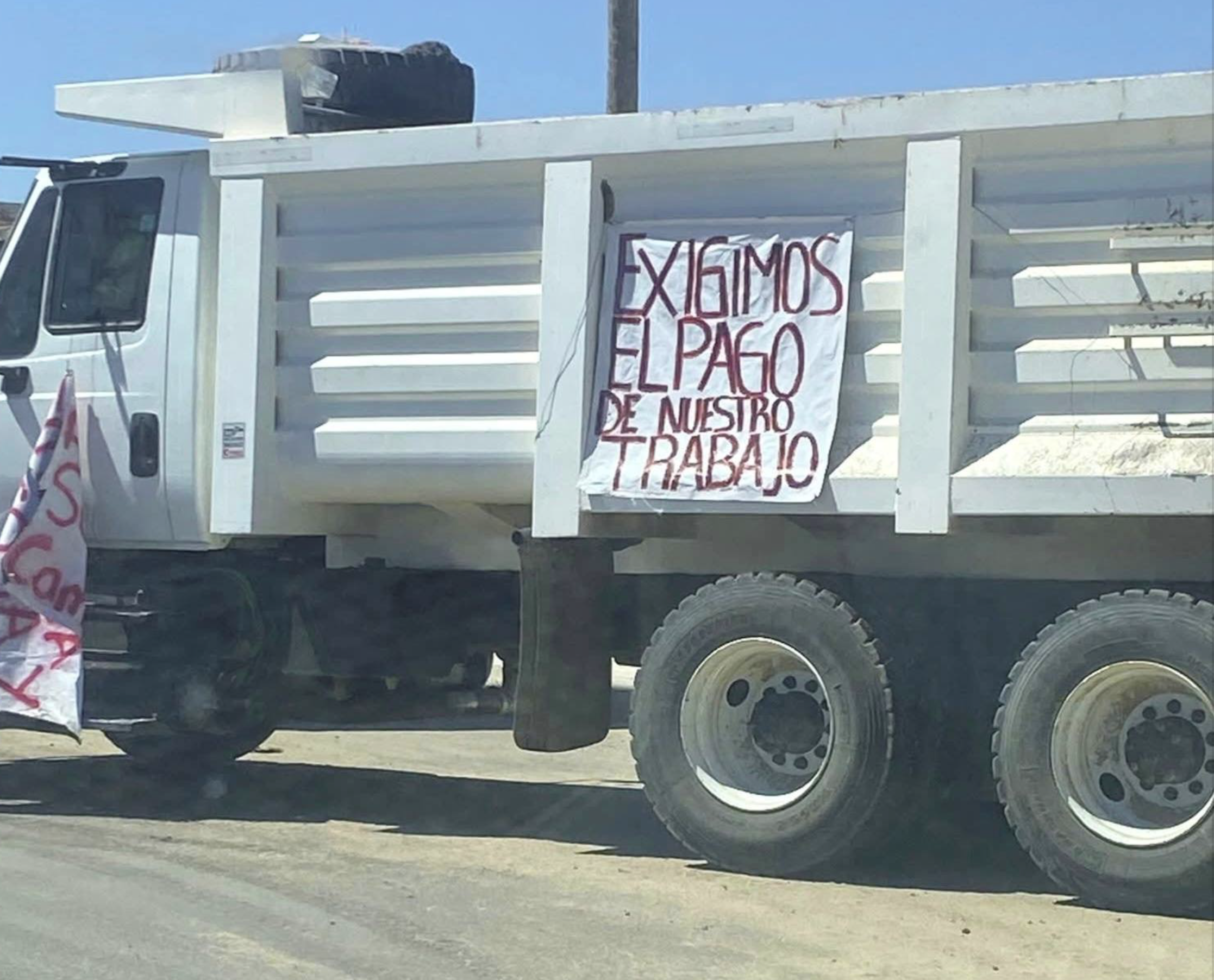 A group of freight transport drivers working on the Fonatur roundabout overpass project in San José del Caboannounced they will block key roads near Mega, City Market, and Chedraui beginning Wednesday, March 18 at approximately 8:00 a.m. as part of a protest over unpaid work.